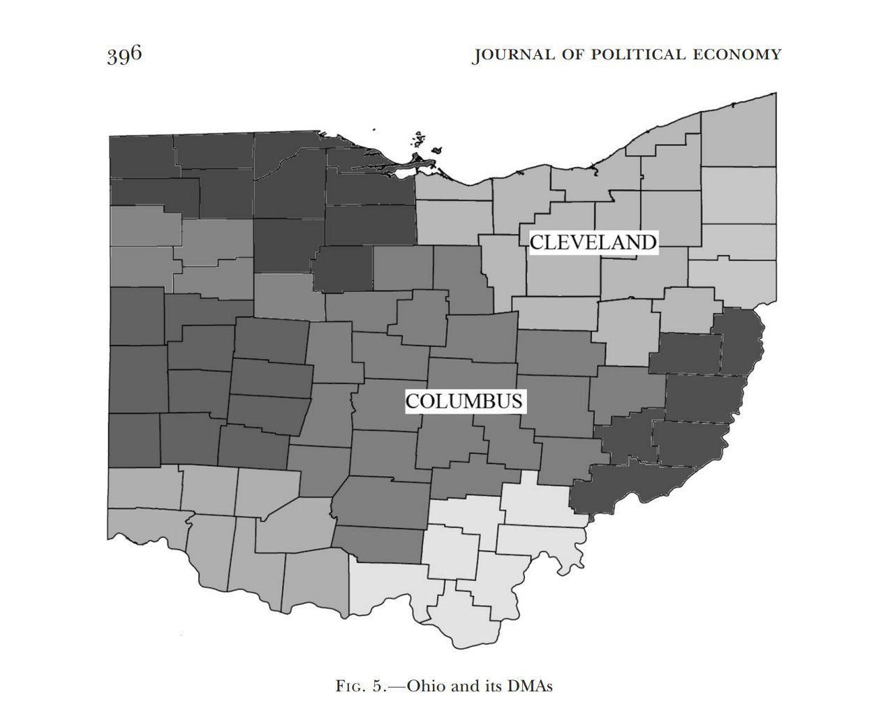 We can compare and contrast these to estimates of advertising in the field, which tends to find that the return on investment is actually negative. Shapiro, Hitsch, and Tuchman (2021) really is the best paper on this for sheer range. As mentioned, advertising is endogenous , so they get exogenous variation from media markets in America. These are centered around major cities, and extend outward into the countryside.