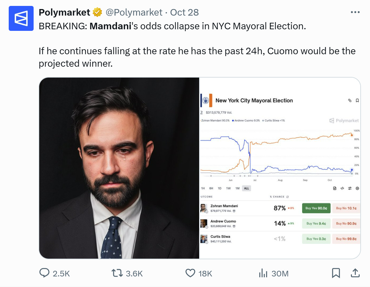 I am instinctively displeased, however, to see how Kalshi and Polymarket promote themselves, especially on Twitter. Whoever they have running the account seems to have no idea how their product works in even the most trivial respects. Take, for instance, this tweet, which seems unaware of how odds should be a first order Markov variable.
