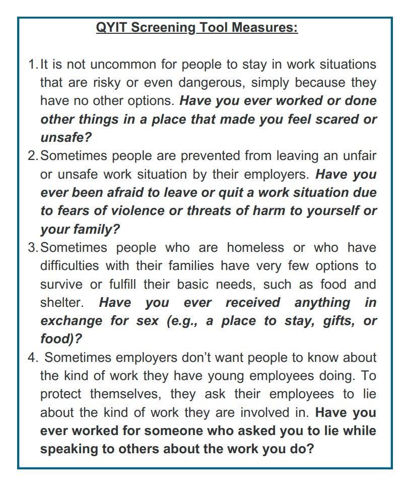 But enough of the insults. The high end study, and the largest, is on Florida, by a large team of authors led by Prof. Joan Reid of USF. The central piece of evidence behind the claim is a survey which they administered to 2,500 Floridians. It consisted of four questions, only one of which, question three, allows us to say anything about sex trafficking.