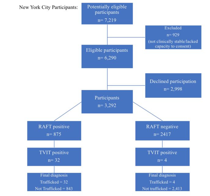 They prominently cite a study, Chisholm-Straker et al (2021), which used a sample of people asked at entry into an emergency room. For simplicity, we’ll use their NYC sample. 3,292 people entered the questionnaire, of whom 2417 did not say yes to anything, while 875 said yes to at least one question. Follow up questions revealed that only 36 were actually trafficked, of whom 16 were sexually trafficked. This implies that of the 4% who said yes, only 1.7% actually were trafficked at any point in their life.