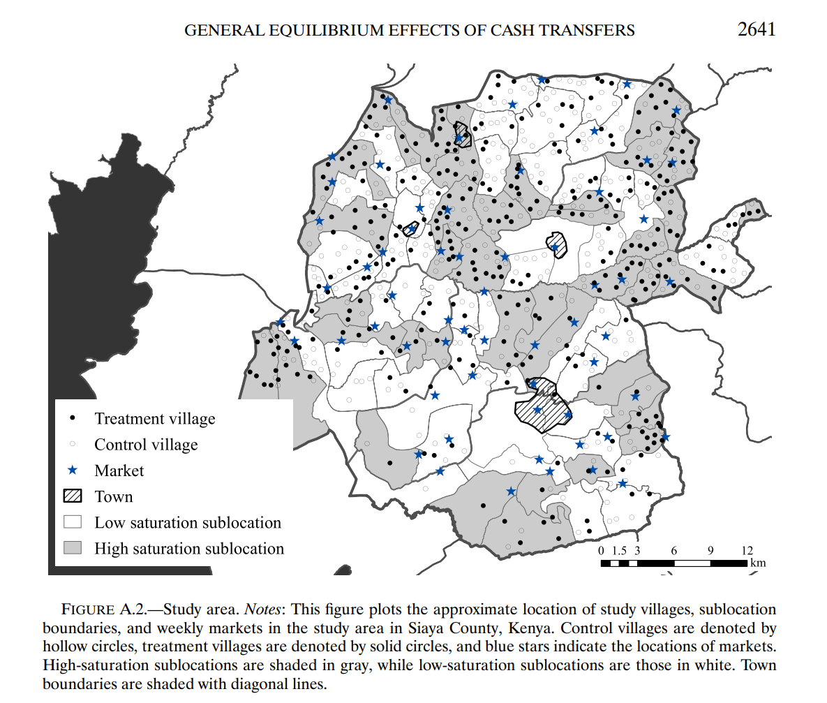 Thankfully, however, the empirical literature disagrees with this, and shows a positive fiscal multiplier. The best study on this is Egger, Haushofer, Miguel, Niehaus, and Walker (2022), who carefully document the effects of an experiment in Kenya. GiveDirectly, a charitable organization of which Niehaus is a founder, allows donors to “give directly” to the poorest people in the world with no strings attached. As you can see below, who received cash transfers was randomized both at the village level, and also into zones where many villages received the cash transfer, and into ones where very few villages did. (Randomization at the village level for a few reasons. One might reasonably be concerned people will share their income with their friends and family, which would break the stable unit treatment value assumption (SUTVA) – if people were very generous, we wouldn’t see any difference in outcomes. Also, as the earlier Miguel and Kremer paper “Worms” showed, you can have direct positive spillovers in other ways. In that paper, some people having their intestinal worms removed meant that they could not then spread it to others, which is another SUTVA violation – you would miss most of the effect, in fact, if you don’t account for this!). In each village, only the poor households – those with thatched roofs – received transfers.
