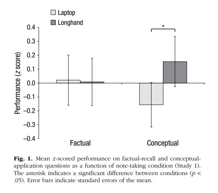What she fails to mention is that there is a now considerable literature replicating this, and the facts are much muddier. Many find no difference in comprehension at all. Morehead, Dunlosky, and Rawson (2019) find that there is nothing magical about longhand note taking versus laptops. Urry et al (2021) (I normally try to credit all authors, but I think she credits all 74 undergraduate students who participated as authors) also directly replicates it, and finds no effect.